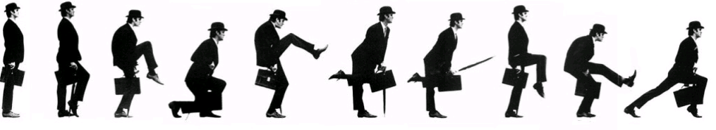 Let us look at a hypothetical patent to clarify some issues. There is a famous “Ministry of Silly Walks” sketch by Monty Python.[13] Michael Palin plays the role of the developer of a silly walk and he likes to obtain a government grant to help him develop it. John Cleese is the examiner. Like Einstein, we will do a thought experiment. Our thought experiment is that we will look at the sketch as if Michael Palin is applying for a patent instead of a subsidy. This way we will get a good picture of the patent application procedure and the consequences of drafting a particular claim for an invention.